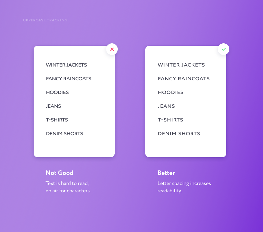 每當(dāng)你使用完全由大寫(xiě)字母組成的文字時(shí),不要忘記設(shè)置字母間距。這樣可以防止字符之間的粘連,也會(huì)讓文字有更好的可讀性。